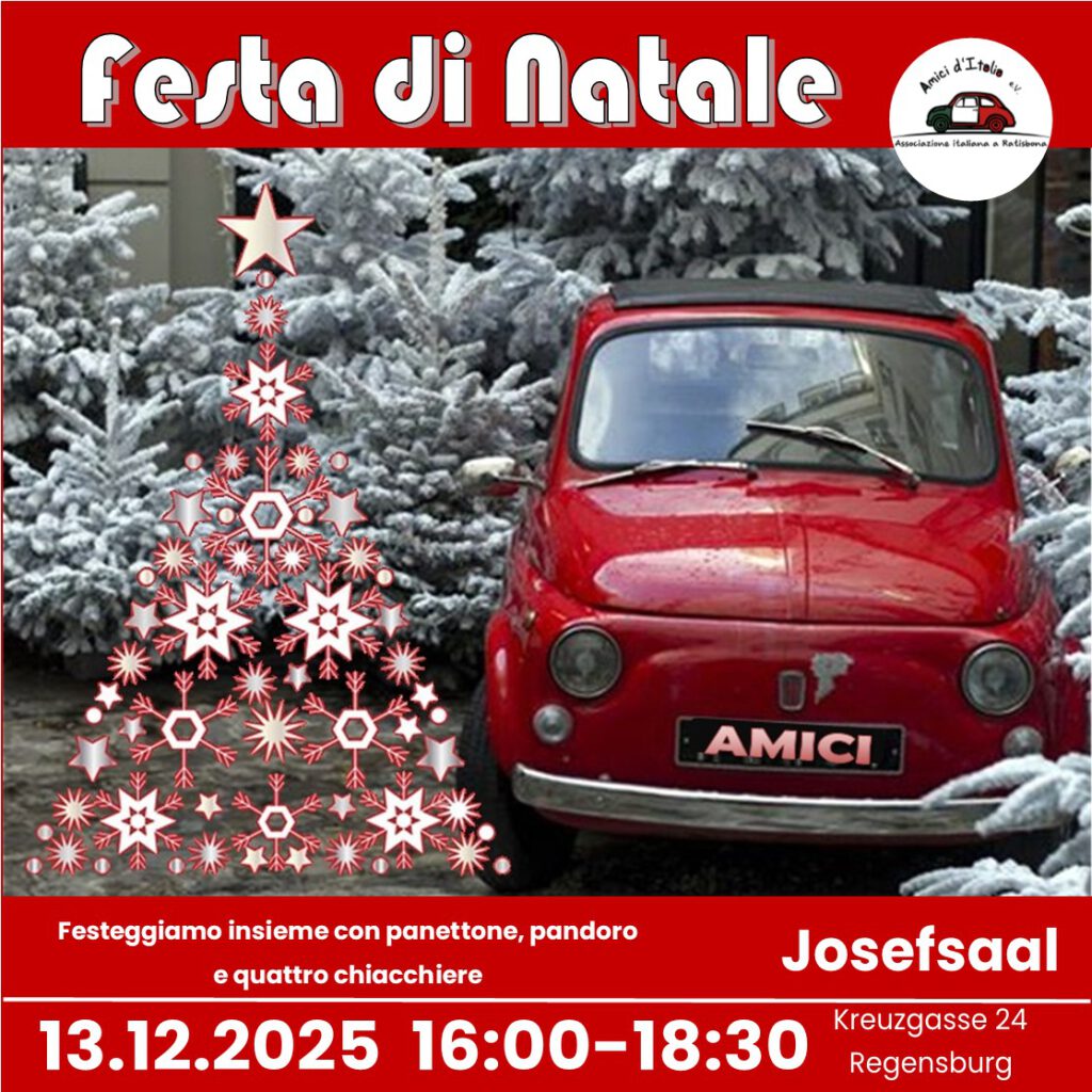 Cari amici, care amiche, Il Natale si avvicina e con esso la nostra tradizionale Festa di Natale. Vi aspettiamo sabato 13 dicembre alla Josefsaal (Kreuzgasse 24), dalle 16:00 alle 18:30, per stare un po’ insieme , gustare un tè o un caffè, fare quattro chiacchiere , giocare a tombola e assaggiare specialità natalizie. A questo proposito sono benvenuti i vostri contributi al buffet, dolci o salati. La festa inizierà alle 16.00 con musiche e canti natalizi con i bambini che hanno partecipato ai laboratori di incontri musicali. Per chi lo desidera, prima della festa, alle 15:00, nella chiesa di St. Leonhard (a 2 minuti dalla sala) verrà celebrata la santa messa in italiano. Ci vediamo alla festa! p.s. Se siete in centro, quest’anno potrete passare al Kulturzentrum Akuso (Rote-Hanen-Gasse) e soffermarvi a guardare il presepe di Amici d’Italia, frutto di un workshop organizzato da noi: una pausa serena tra acquisti e trambusto prenatalizio. Il Direttivo