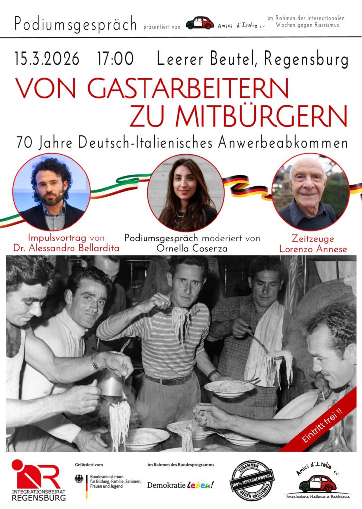 Unterzeichnung der deutsch-italienischen Anwerbeabkommen am 20. Dezember 1955. wie kam es zu diesem Abkommen ? Welche historischen Hintergründe spielten dabei eine Rolle? Und wer waren die ersten ItalienerInnen, die nach Deutschland kamen? Im Rahmen dieser Veranstaltung werden wir in Worte und Bilder an die so genannten “GastarbeiterInnen” erinnern, die einen wesentlichen Beitrag zum Wiederaufbau der Bundesrepublik geleistet haben, aber auch über die nachfolgenden Generationen berichten.