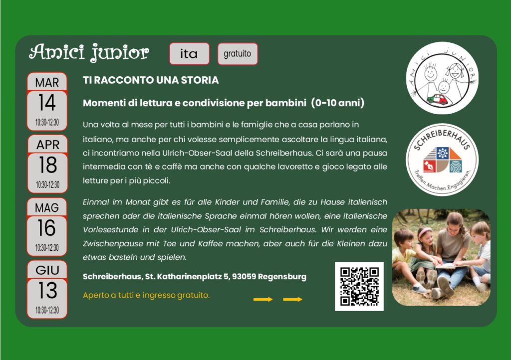 I bambini che crescono in Germania con almeno un genitore italiano, normalmente ascoltano ed usano un italiano legato alla quotidianità. Per ampliare il loro orizzonte linguistico e culturale abbiamo pensato ad incontri-gioco su temi ogni volta diversi (dalla musica alla fisica, dalla geografia alla cucina, dalla matematica alla poesia…) in una situazione di immersione totale, con referenti italiani “esperti”.