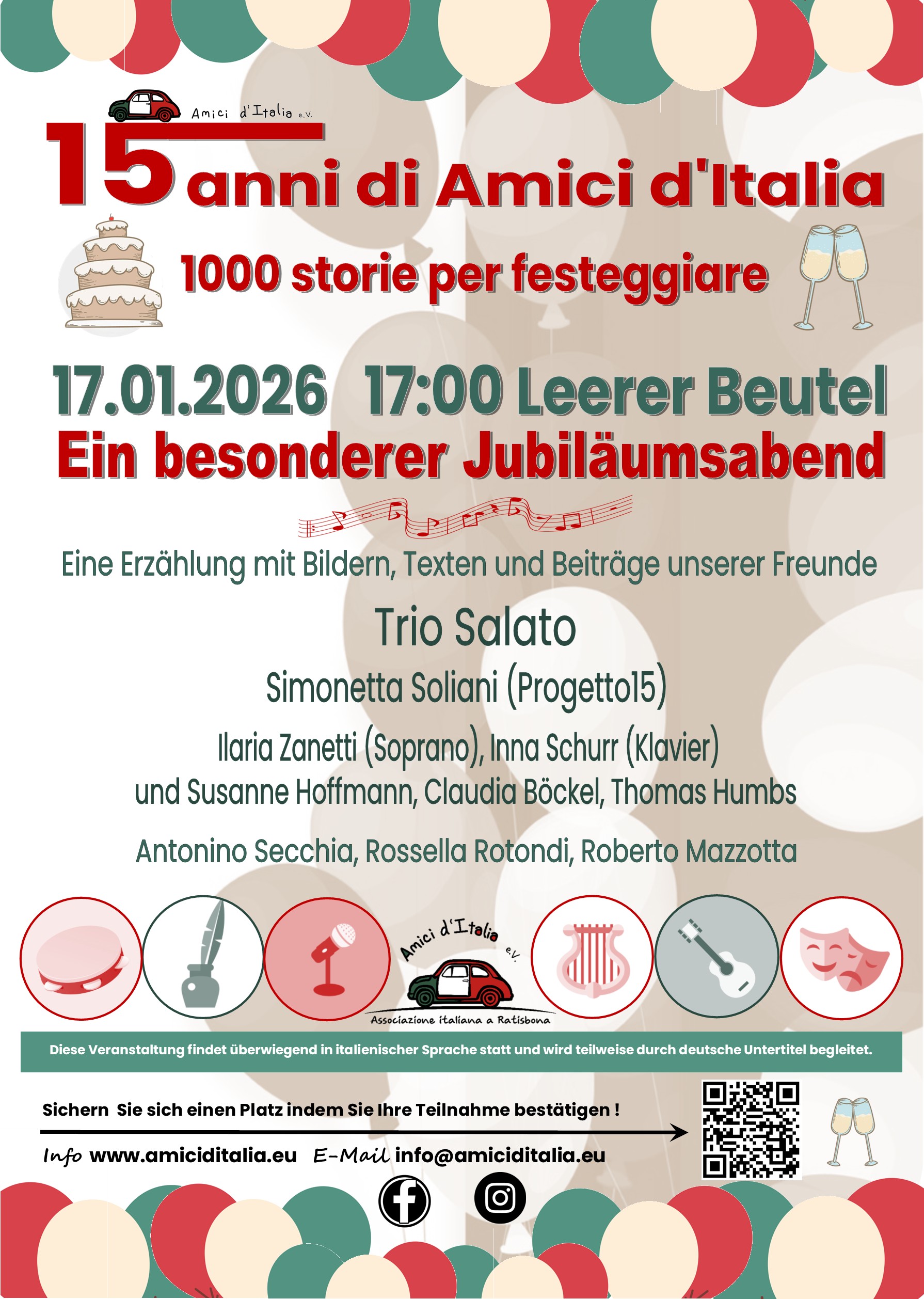 La nostra associazione Amici d’Italia compie 15 anni. In questi anni Amici d’Italia ha contribuito alla conoscenza ed alla diffusione della lingua e della cultura italiane nel nostro territorio con conferenze, concerti, serate cinematografiche e … Leggi tutto 🎄15 anni di Amici d’Italia- 1000 storie per festeggiare